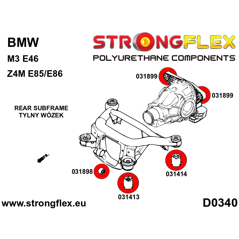 Include:2 x 031248B Front anti roll bar bush2 x 031516B Front wishbone rear bush 60mm2 x 031173B Rear trailing arm front bush2 x 031174B Rear control arm upper inner bush2 x 031176B Rear control arm lower inner bush2 x 031586B Rear anti roll bar bush2 x 031413B Rear subframe front bush2 x 031414B Rear subframe rear bush1 x 031898A Rear differential - front mount bush M3 SPORT2 x 031899A Rear differential - rear mount bush M3 SPORT2 x 031962B Rear anti roll bar link to anti roll bar bush2 x 031963B Rear anti roll bar link to arm bush